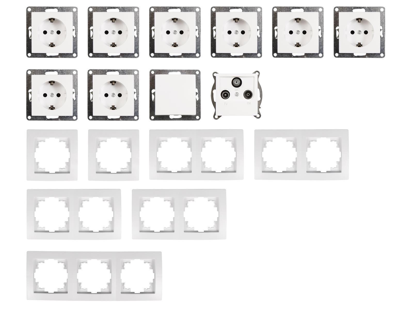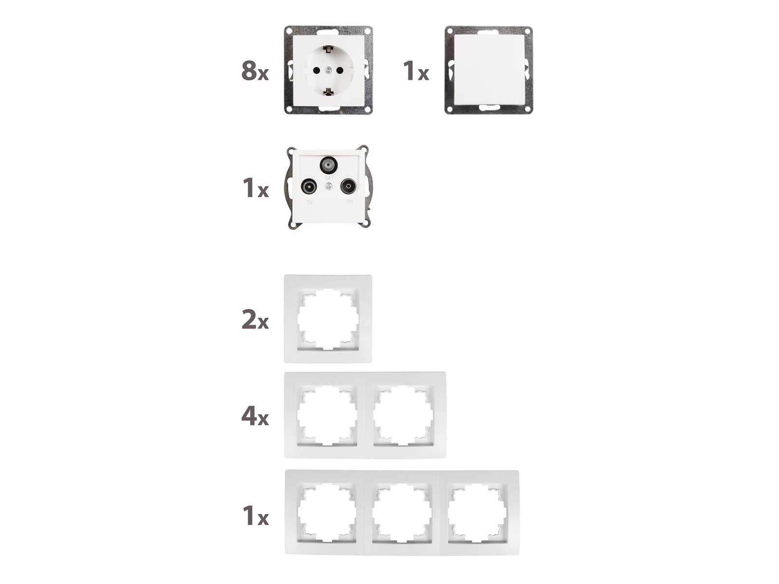 - Lieferumfang: • 1x Wechselschalter 1534800 • 8x Steckdose 1534804 • 1x Antenndose • 1x Rahmen 3fach 1534810 • 4x Rahmen 2fach 1534809 • 2x Rahmen 1fach 1534808