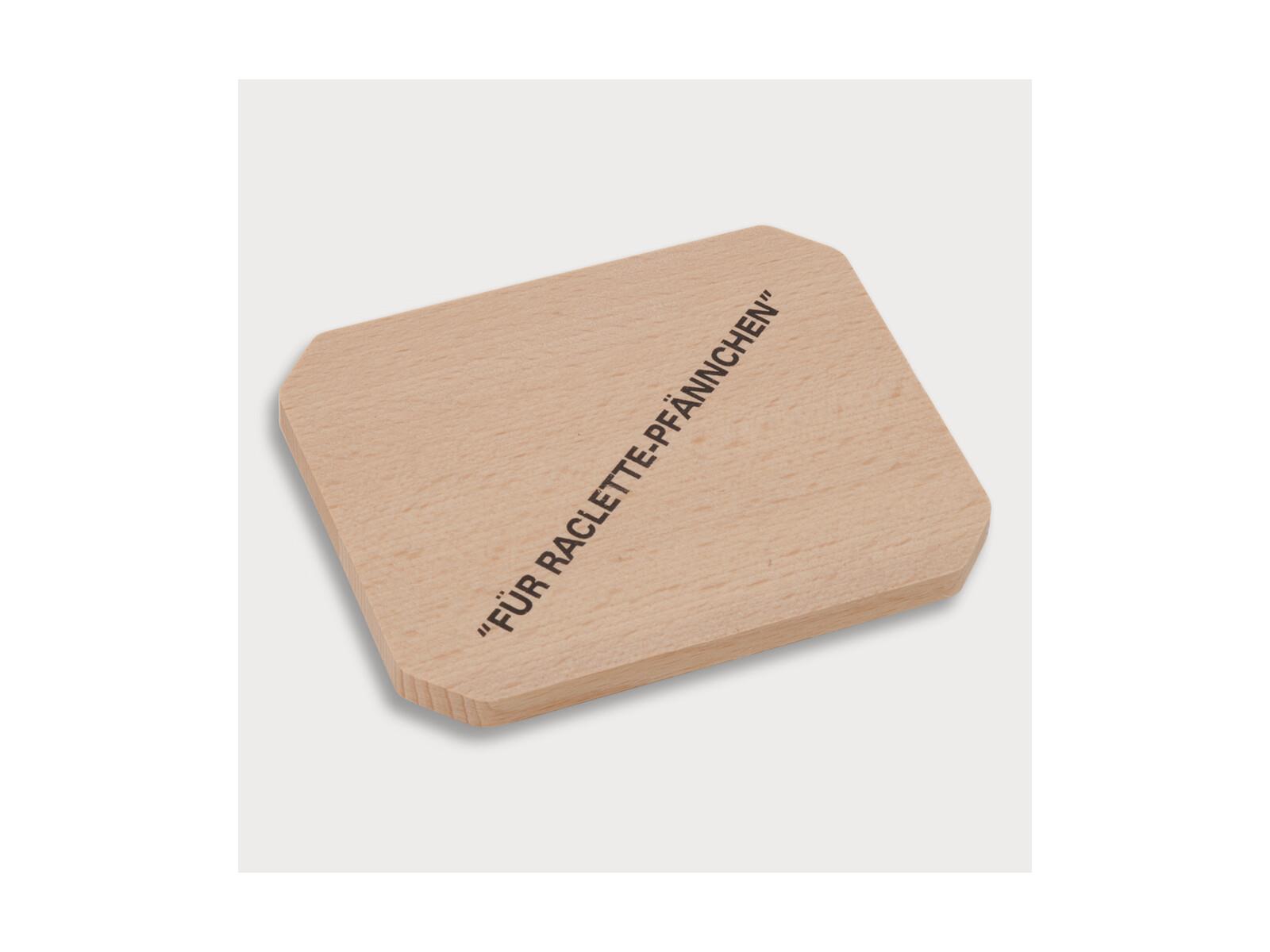 Produktinformationen "Brettchen für Raclettepfännchen, mit abgeschrägten Ecken und Aufdruck aus Holz 10 cm"