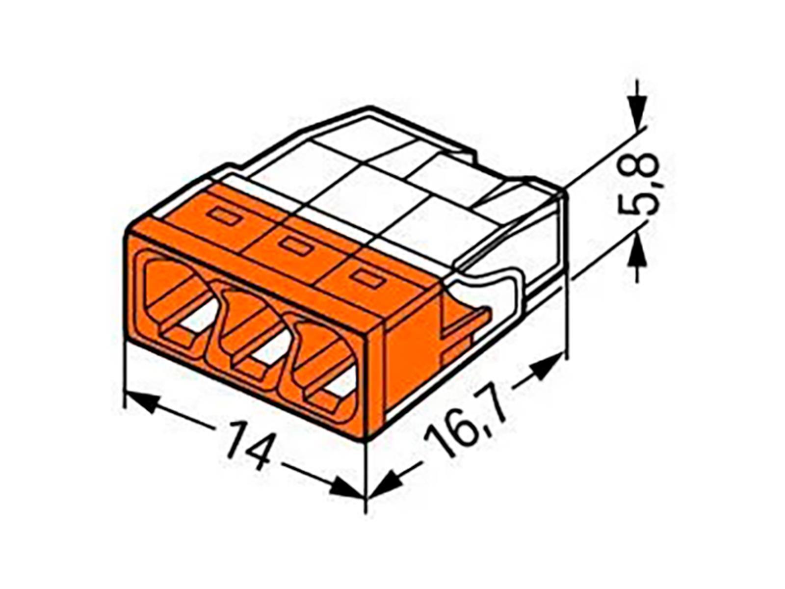 • WAGO Art.-Nr. 2273-203 • bis zu 8 eindrähtige Leiter steckbar • Querschnittsbereich: 0,5mm²-2,5mm² • Bemessungsspannung: 450V • Bemessungsstrom: 24A • Anschließbare Leitwerkstoffe: Kupfer, Aluminium • Farbe: transparent • Deckelfarbe: orange