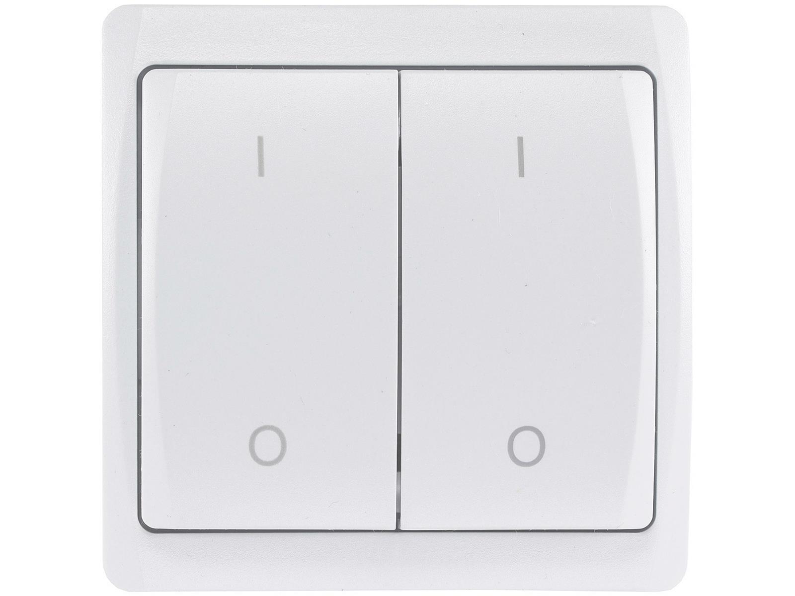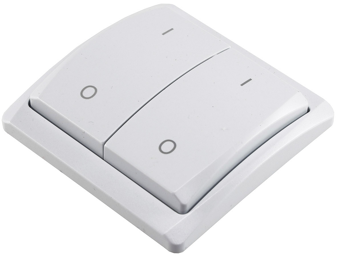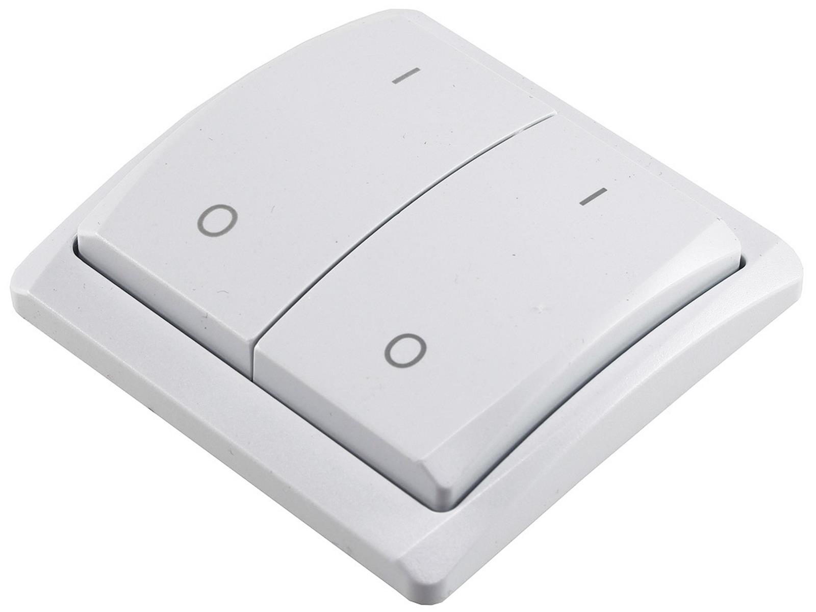 Passender 2-fach Wandsender (Funk-Schalter) für den Funk-Empfänger CT-FR1 . Es ist kein Anschluss via 230V nötig, der Schalter wird über eine A23 Batterie mit Strom versorgt.