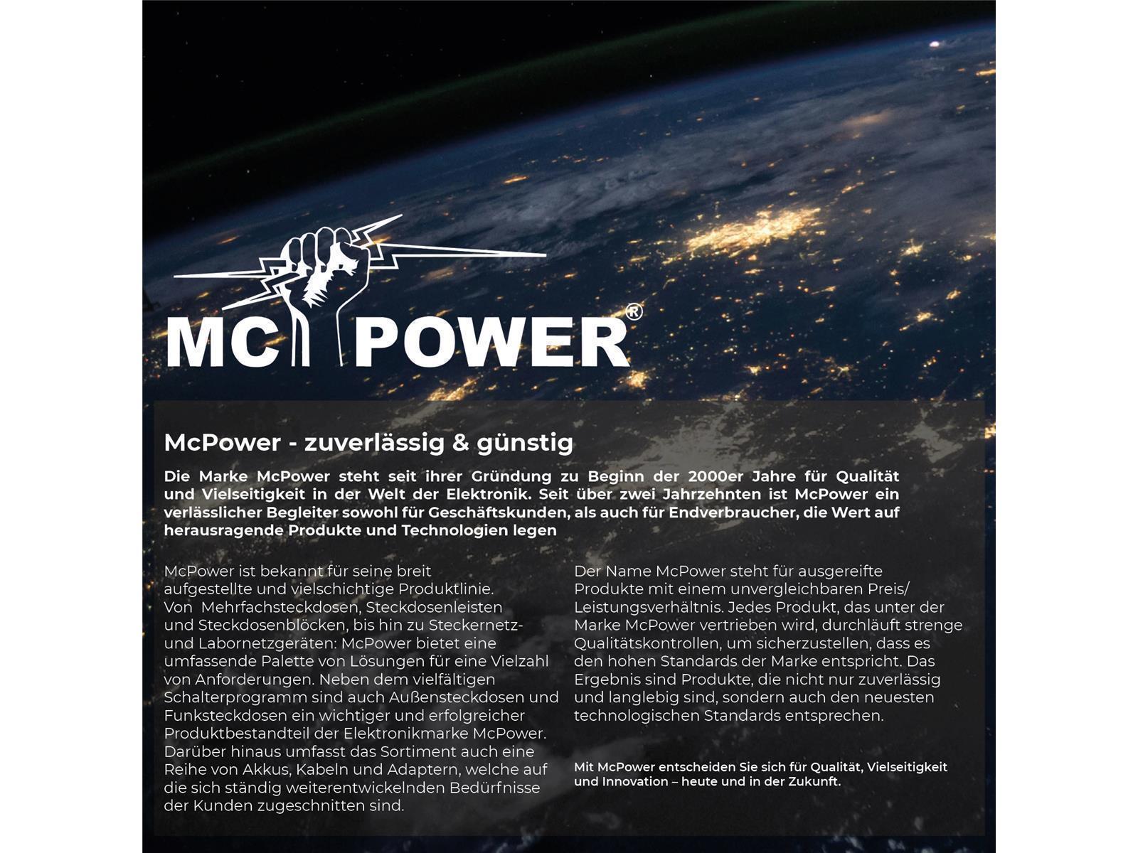 McPower ist bekannt für seine breit aufgestellte und vielschichtige Produktlinie. Von Mehrfachsteckdosen, Steckdosenleisten und Steckdosenblöcken, bis hin zu Steckernetz- und Labornetzgeräten: McPower bietet eine umfassende Palette von Lösungen für eine Vielzahl von Anforderungen. Neben dem vielfältigen Schalterprogramm sind auch Außensteckdosen und Funksteckdosen ein wichtiger und erfolgreicher Produktbestandteil der Elektronikmarke McPower.