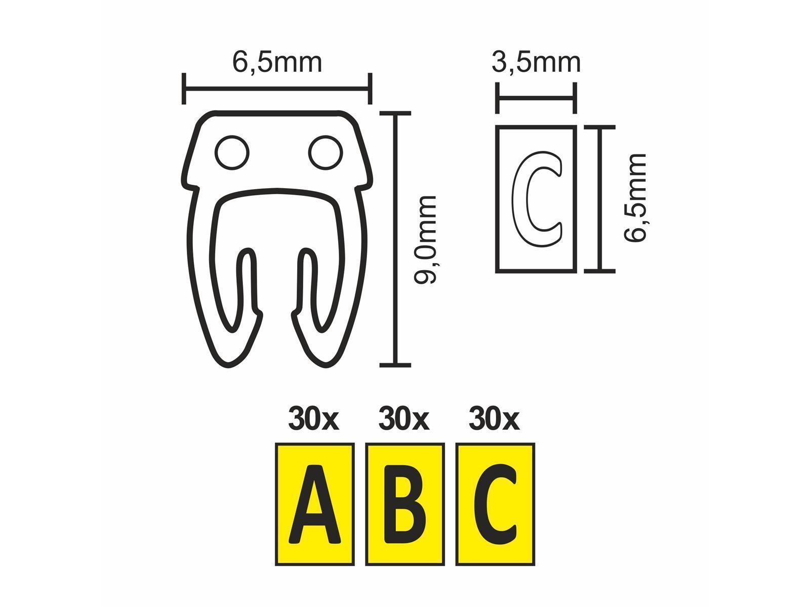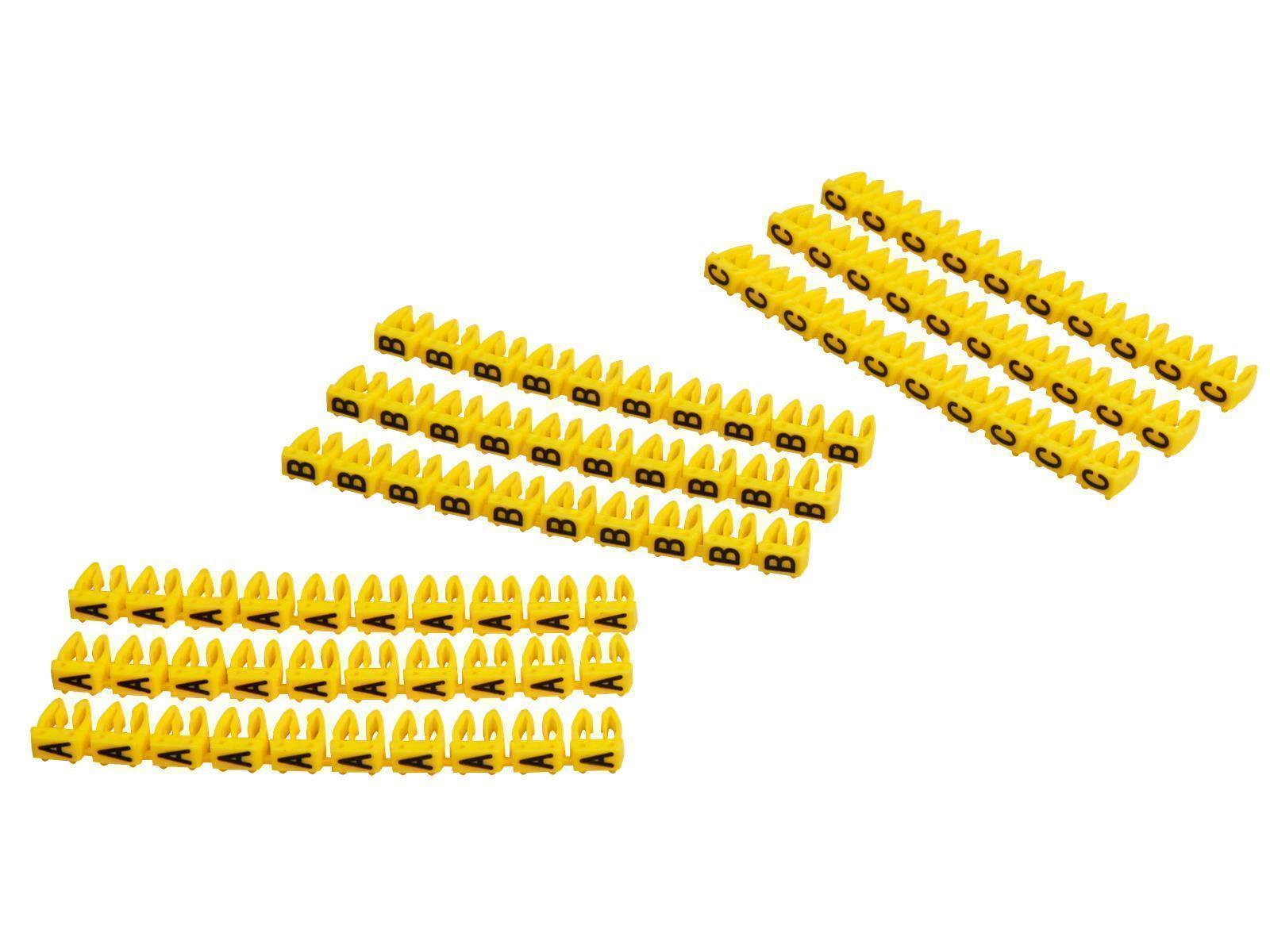 • für Kabeldurchmesser von ca. 4,0mm² - 6,0mm² • 30 Stück je Buchstabe - Buchstaben A, B und C • Farbe: gelb mit schwarzem Druck • einfache Montage • mehrere Ringe können verbunden werden, ohne zu verdrehen • Kompatibel mit Kabelmarker-Ziffern Clips von McPower • 90er-Pack