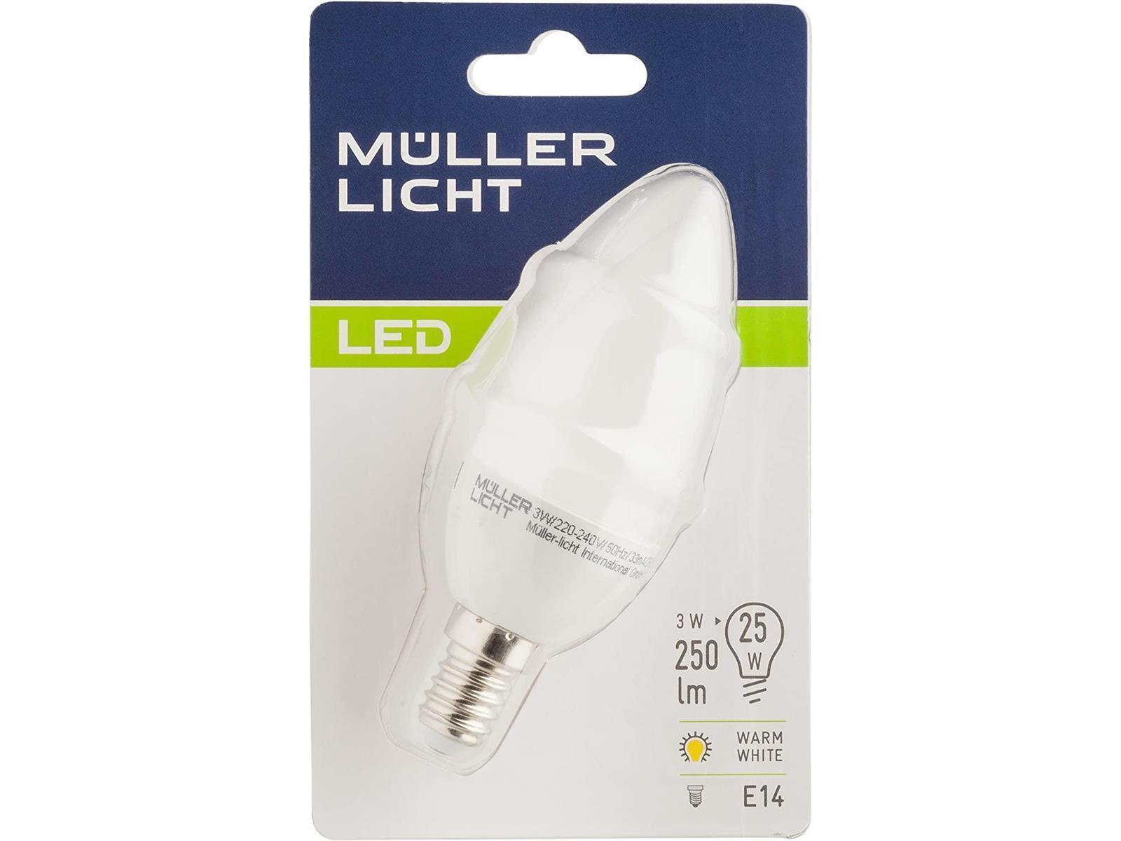 • Sockel E14 • Lichtstrom 250 Lumen • Lichtfarbe: warmweiß • Farbtemperatur 2700 K • Abstrahlwinkel 180° • Leistungsaufnahme 3W • Spannung 220-240V • Energieeffizienzklasse G • Lebensdauer 25.000 Stunden • On/Off 100.000x • Anlaufzeit <1s = 60% Licht • Farbwiedergabeindex Ra >80 • Temperaturbereich -20 °C bis +40 °C • Maße: 38x108mm • nicht dimmbar