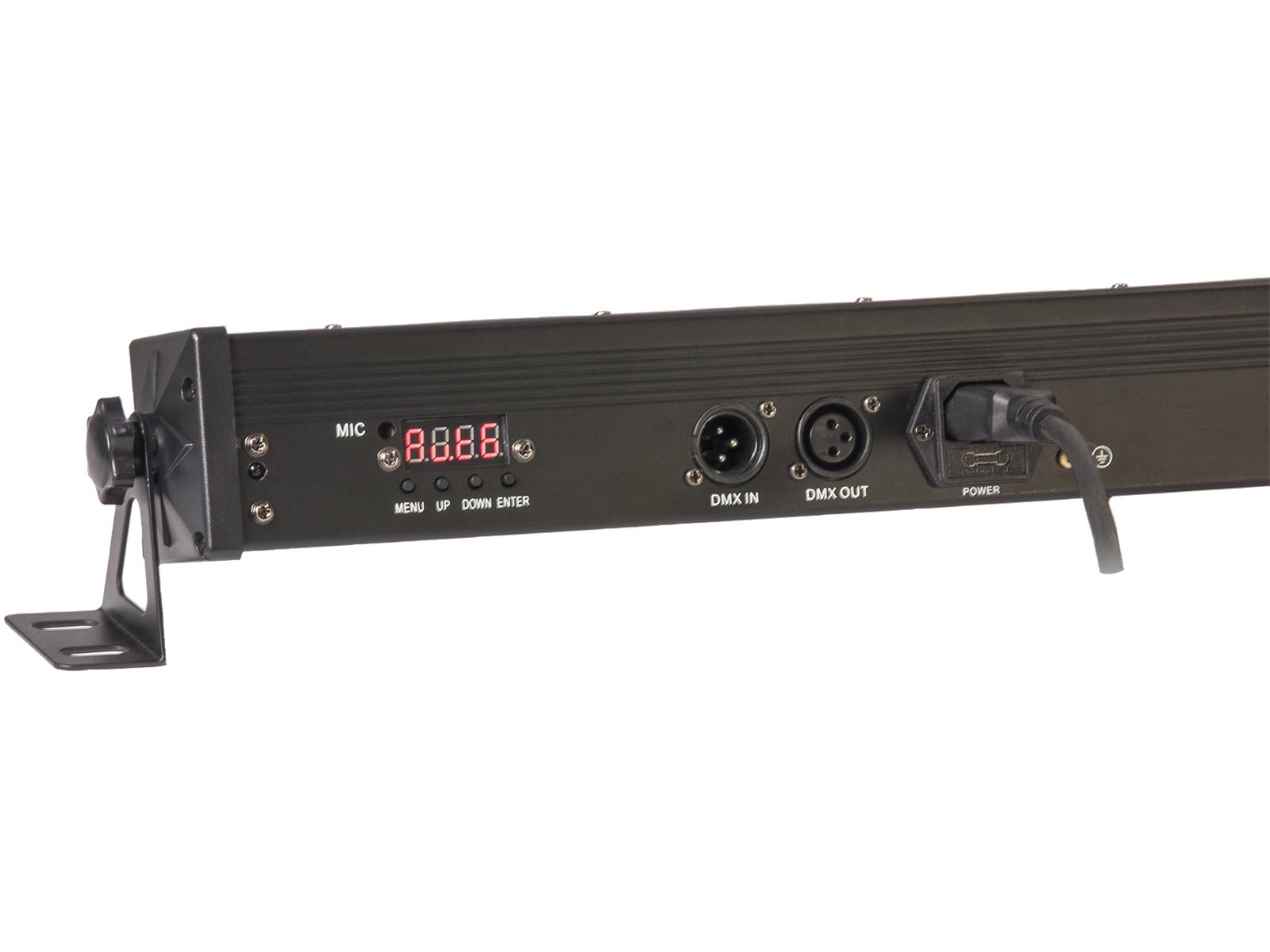 • 6 / 9 / 16 / 58 DMX Kanäle • 4-Tasten Bedienfeld mit LED Display • 24 rot-grün-blau-weiße LEDs von jeweils 4W • Matrix Funktion per 3er Gruppen • Betriebsarten : Automatisch, musikgesteuert, DMX, Master/Slave & Fernbedienung • Bodenständer & Fernbedienung • Verbrauch 100W • Abstrahlwinkel 35° • Maße 1050x100x100mm • Gewicht 4,5kg