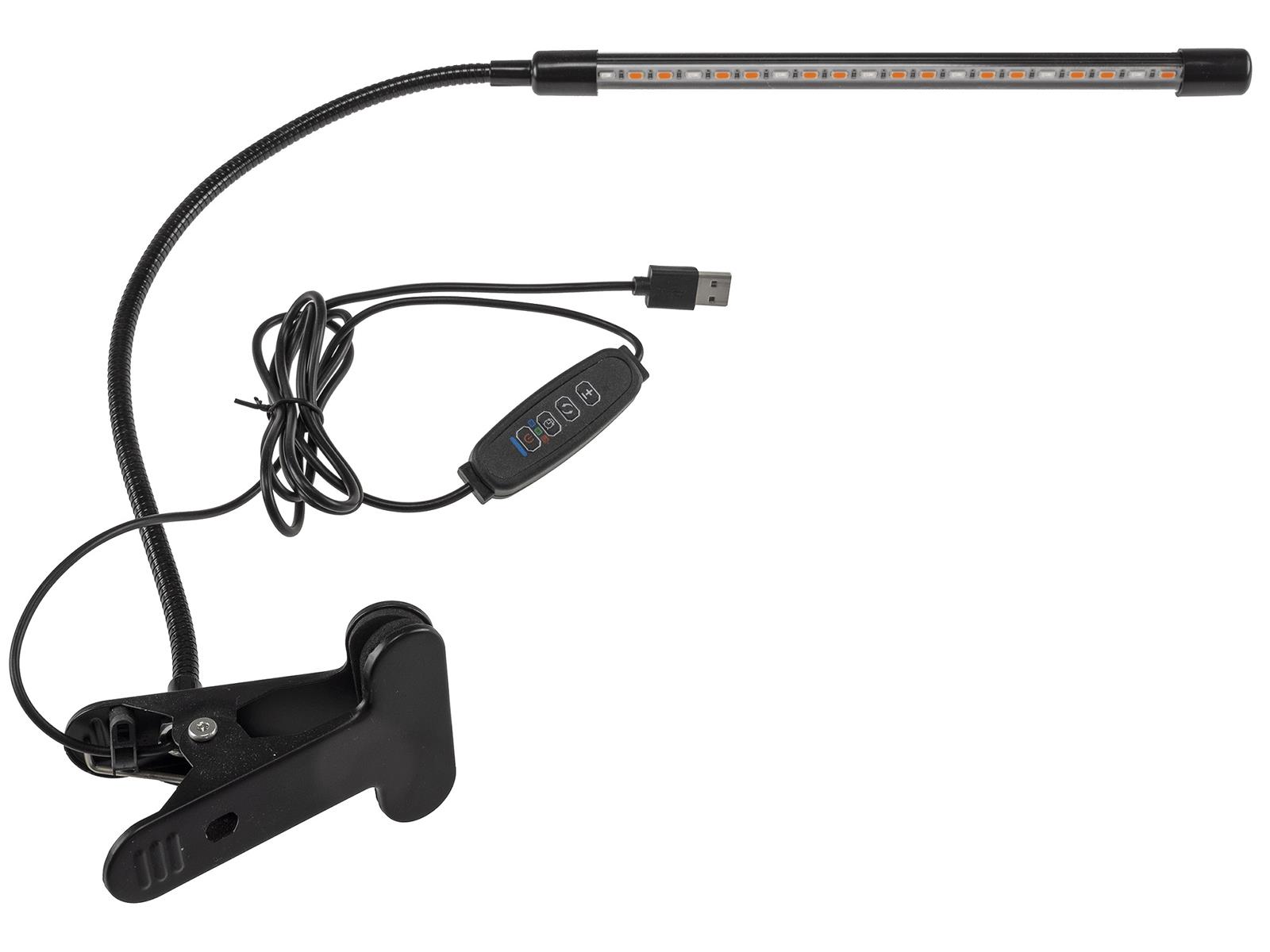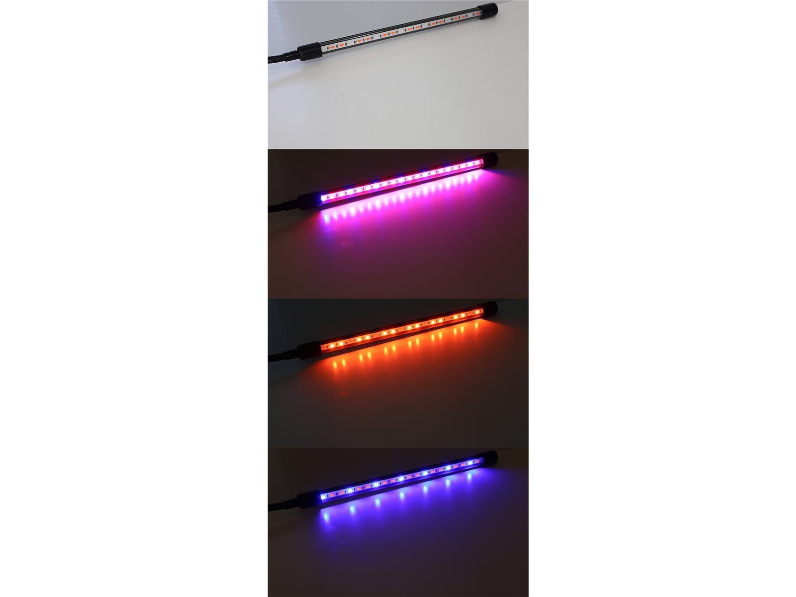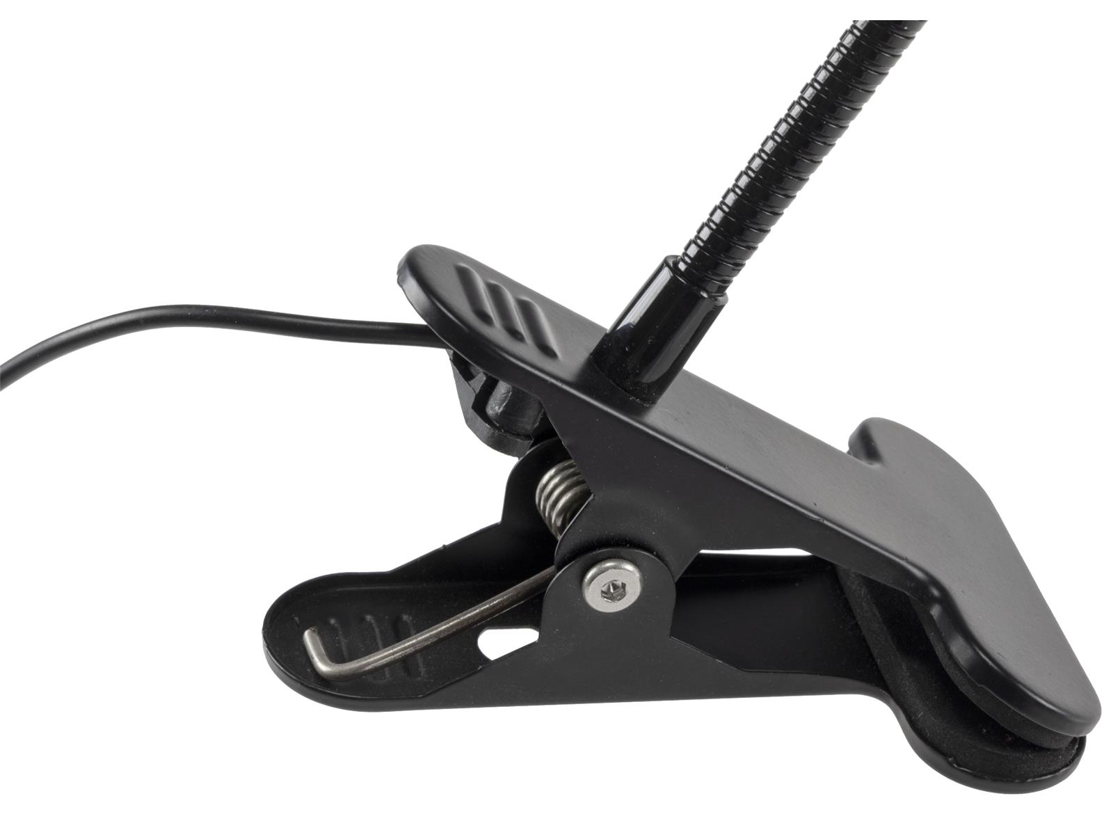Einfachste Platzierung dank des 35cm langen und flexiblen Schwanenhalses, einfach mit stabilem Clip-Halter an bis zu 3,5cm starken Tischplatten, Regalböden oder Fensterbänken befestigt. Die Leuchte selbst ist 26cm lang und verfügt über 13 rote sowie 7 blaue LEDs. Der Controller befindet sich am 1,5m langen USB Kabel.