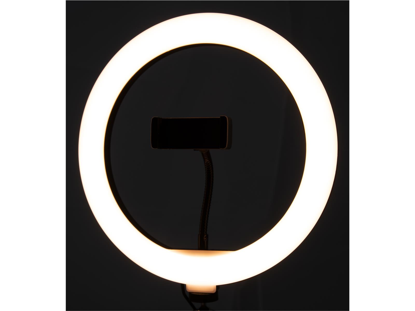 • Für 4–7” Smartphones • Einstellbare Farbtemperatur: warmes Licht, natürliches Licht, kühles Licht • Helligkeitsregelung • Smartphone-Halterung mit integriertem Stativ, einstellbare Höhe: 23 - 40 cm • Ringlicht-Durchmesser: 25 cm • Strom über USB-Anschluss • Mit dem mitgelieferten Fernauslöser können Sie Ihr Telefon steuern, während Sie Fotos oder Videos aufnehmen • 120x LEDs • Eingang: DC 5 V/2 A (10 W max.) • Material: Kunststoff • Kabellänge: 1,8 m