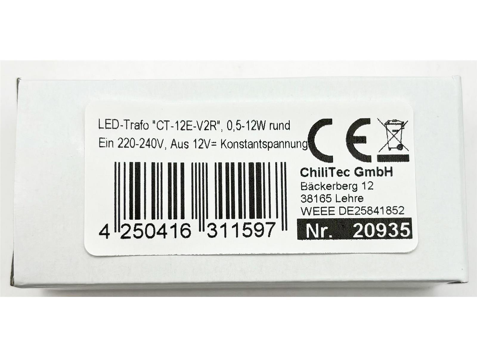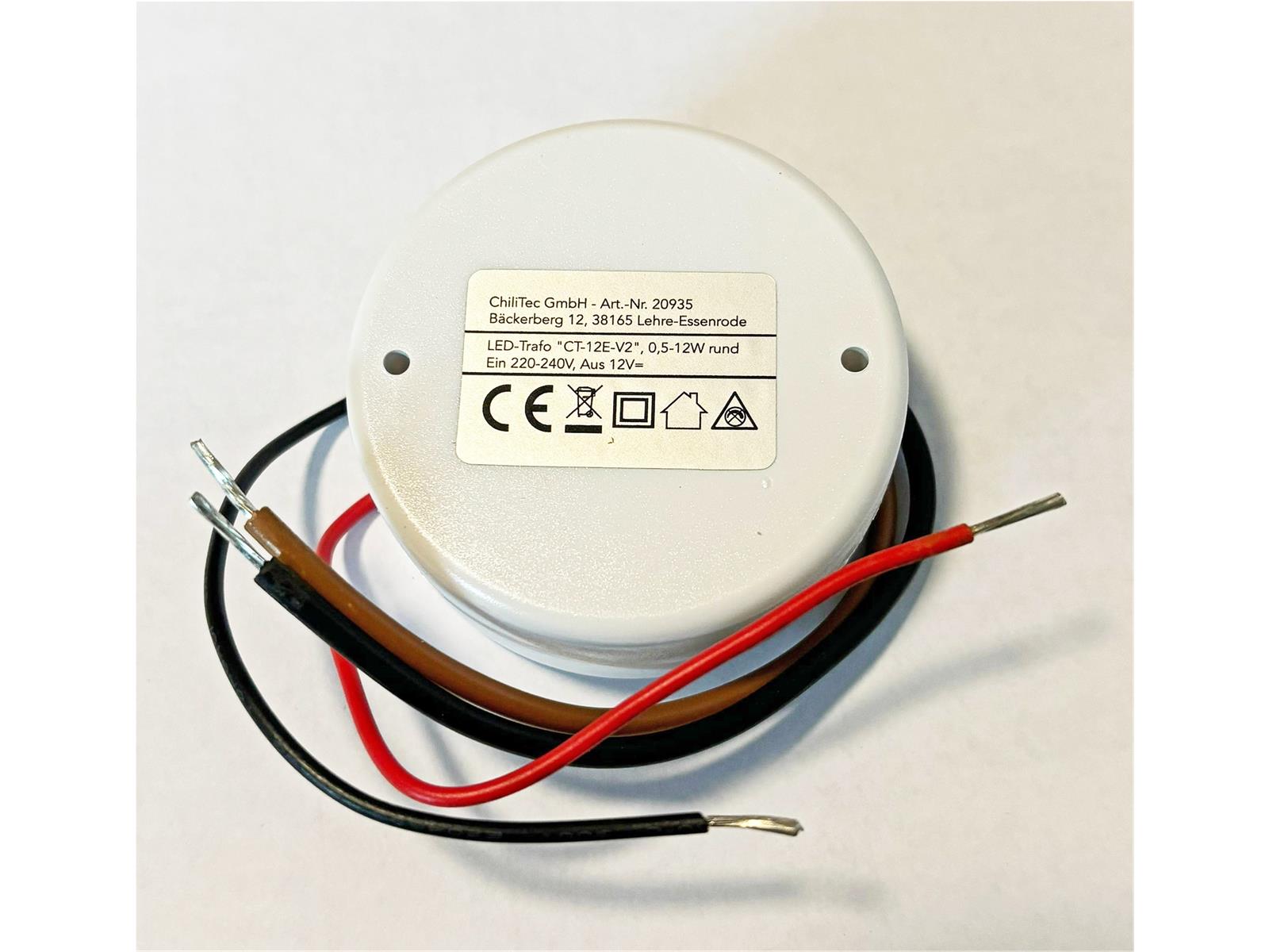 Produktinformationen "LED-Trafo "CT-12E-V2R", 0,5-12W rundEin 220-240V, Aus 12V= Konstantspannung"