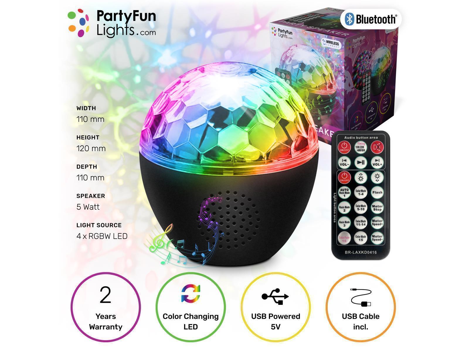 • Bluetooth • Wasserdicht: Nein • Kabellose Reichweite: < 10 Meter • Drahtlose Kompatibilität: Bluetooth • Lautsprecher-Ausgang: 10 Watt • Stromversorgung: 5V USB 2.0 • Licht-Klang-Aktiv-Modi: 4 • Licht-Dimm-Modi: 8 • Lichtgeschwindigkeits-Modi: 5 Stufen • LEDs: 16 RGB • Maße: 110x120x110mm