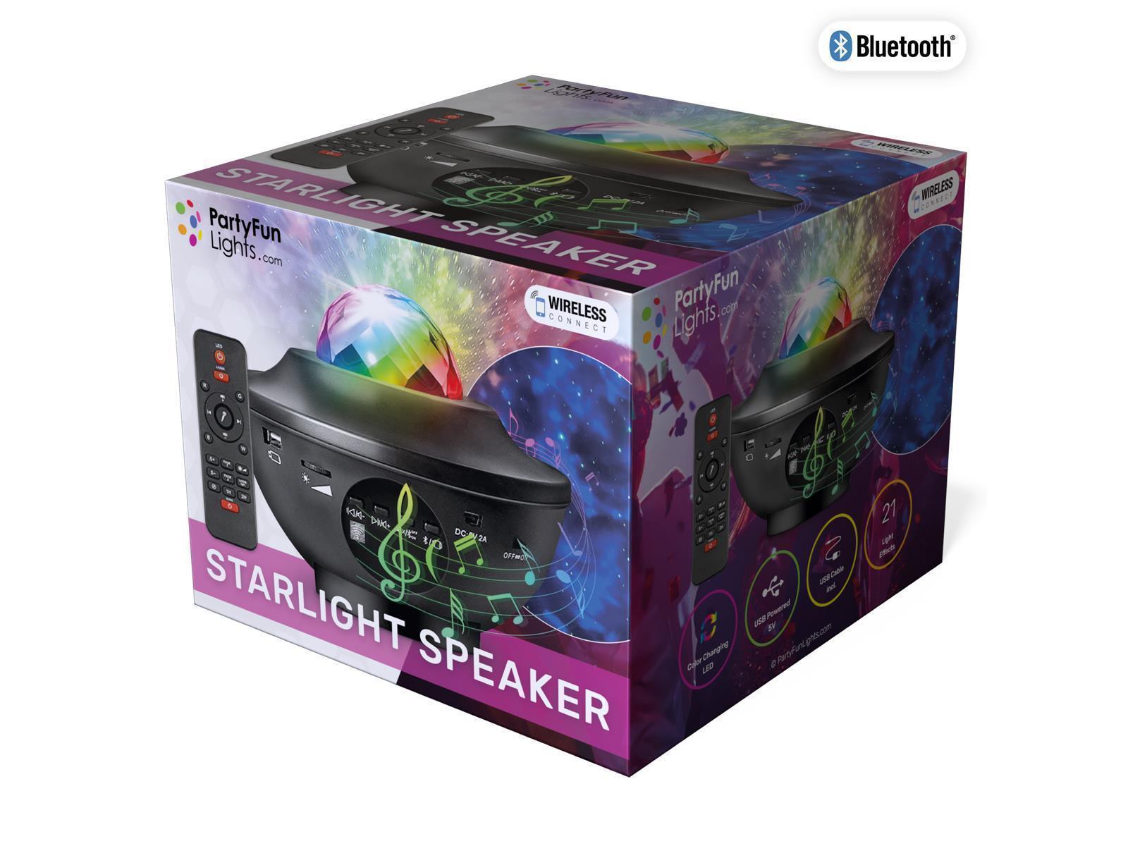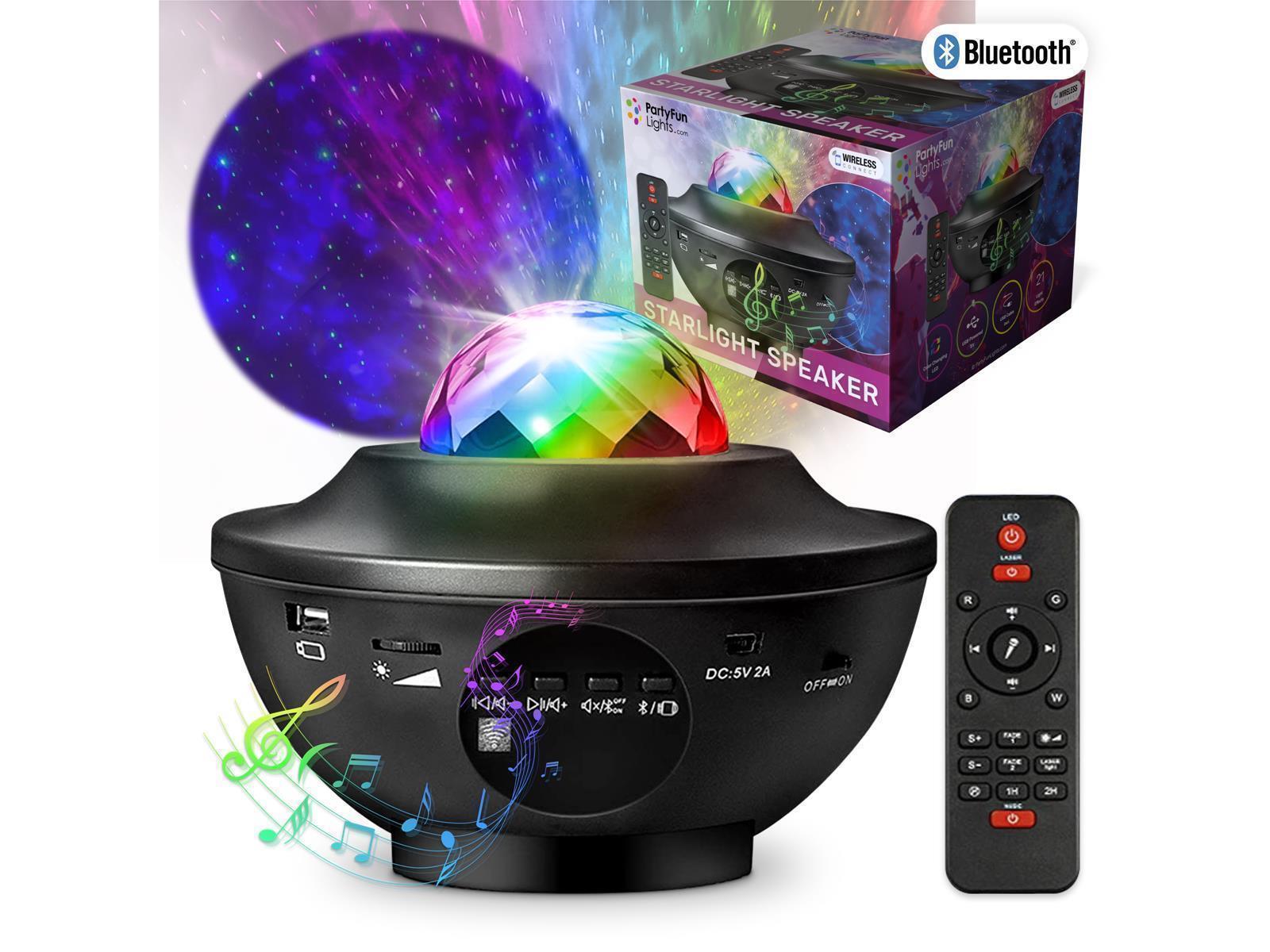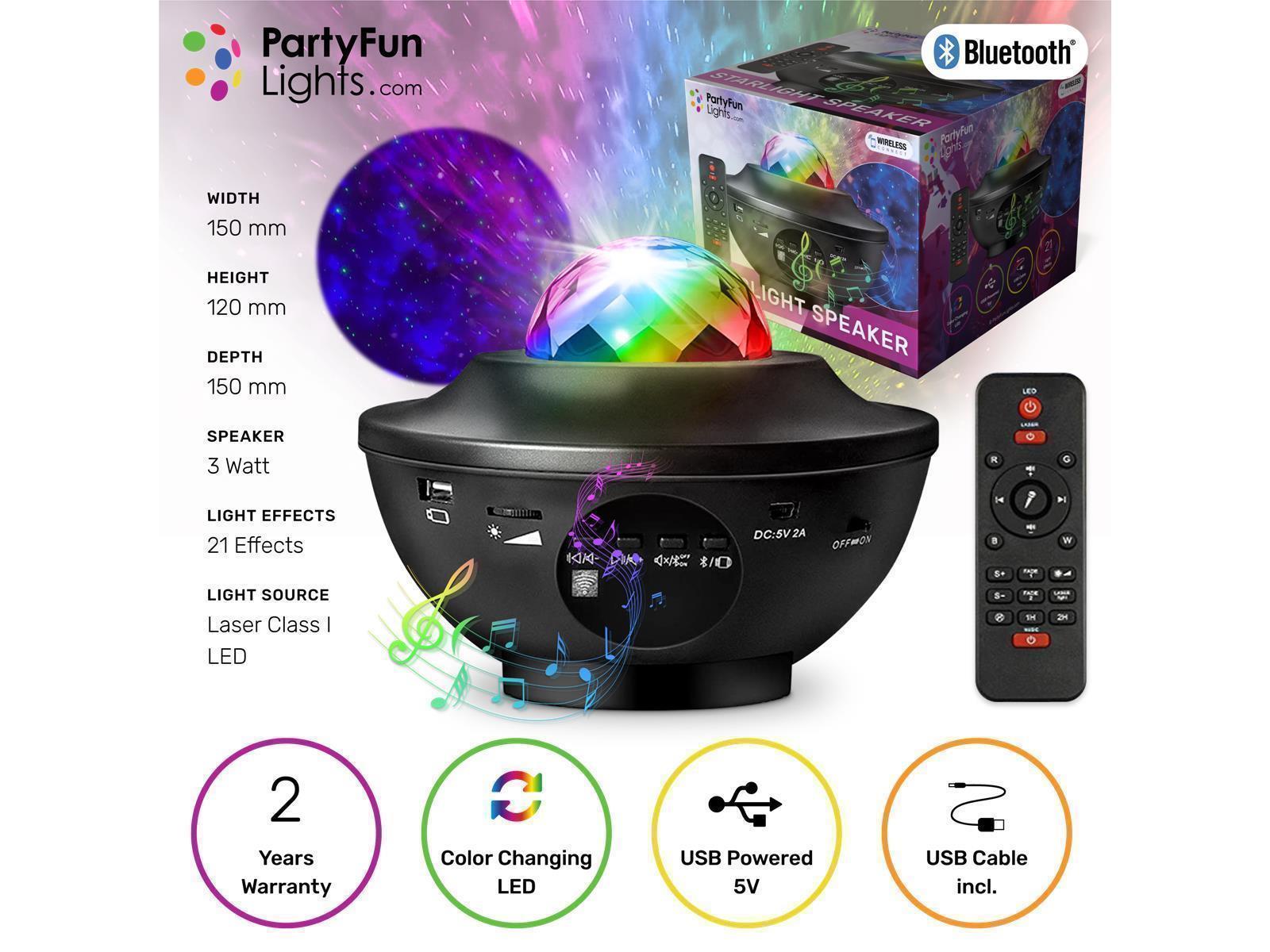 • Bluetooth • Wasserdicht: Nein • Kabellose Reichweite: < 10 Meter • Drahtlose Kompatibilität: Bluetooth • Lautsprecher-Ausgang: 10 Watt • Stromversorgung: 5V USB 2.0 • Licht-Modi:21 • LEDs: 16 RGB • Laser Klasse I • Maße: 150x120x150mm