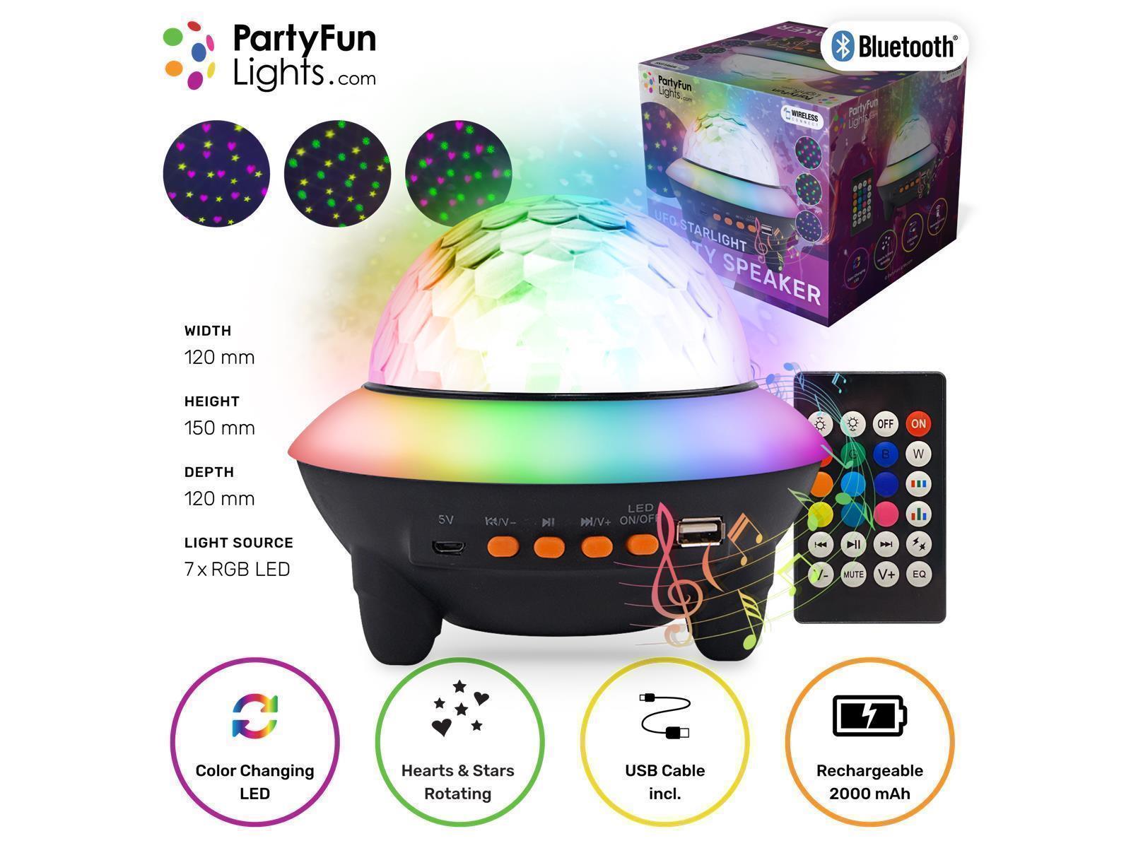 • Bluetooth • Wasserdicht: Nein • Kabellose Reichweite: < 10 Meter • Drahtlose Kompatibilität: Bluetooth • 2000 mAh wiederaufladbare Batterie • Maße: 150x120x150mm • mit versch. Lichteffekten • 7 RGB LEDs