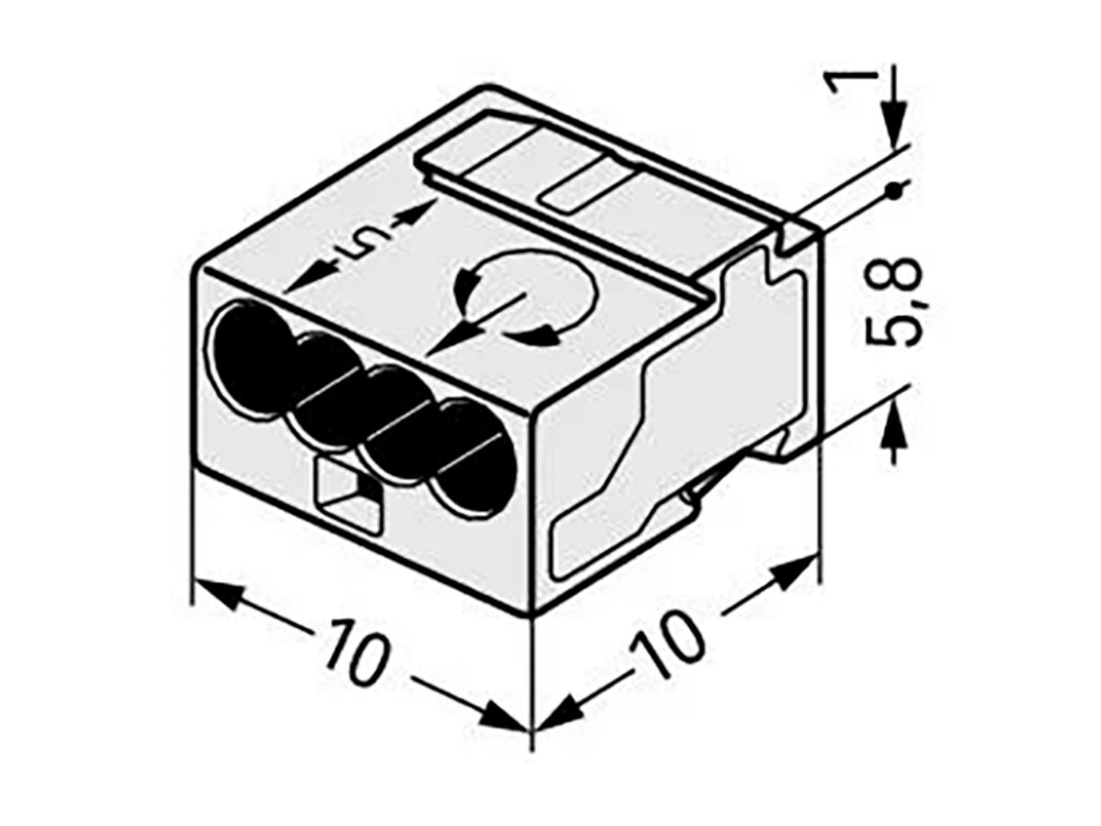 • WAGO Art.-Nr. 243-304 • Bemessungsspannung: 100V • Bemessungsstrom: 6A • Anzahl klemmstellen: 4 • Verdrahtungsrichtung: seitlich • Maße: 10x6,8x10mm • Farbe: grau
