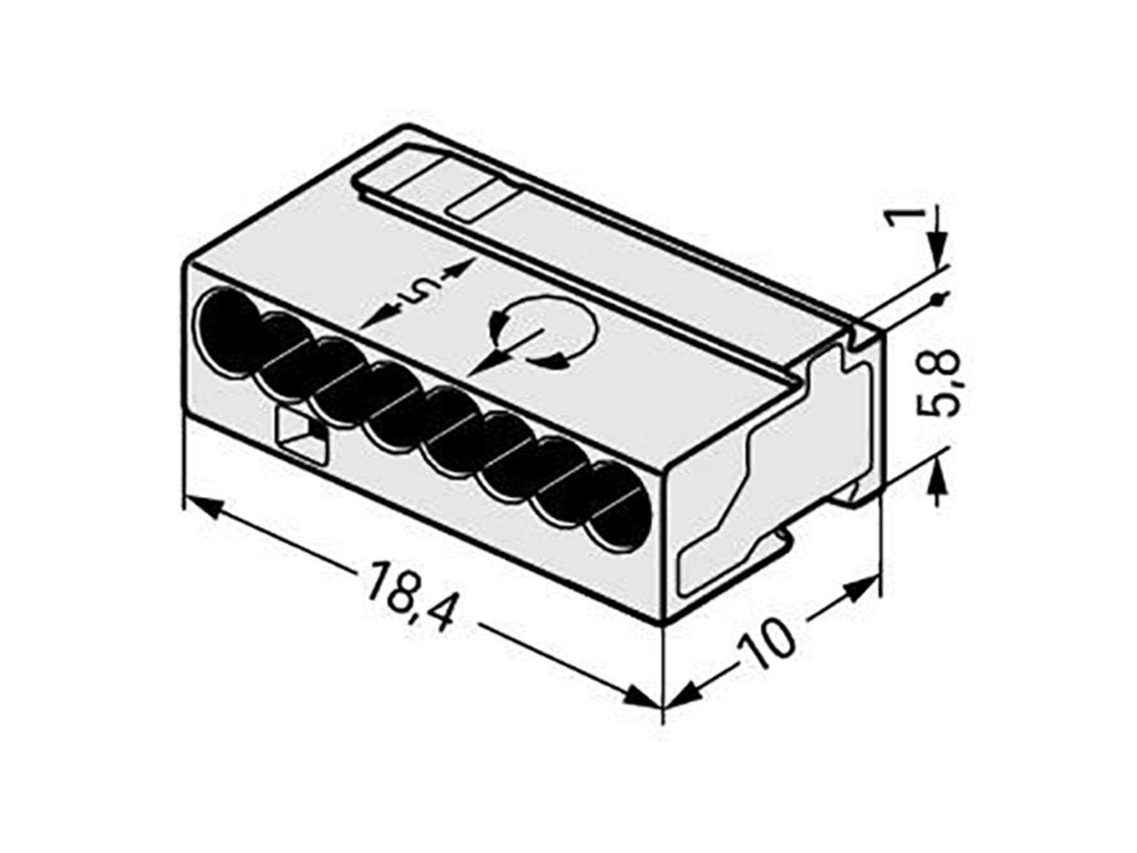 • WAGO Art.-Nr. 243-308 • Bemessungsspannung: 100V • Bemessungsstrom: 6A • Anzahl Klemmstellen: 8 • Verdrahtungsrichtung: seitlich • Maße: 18,4x6,8x10mm • Farbe: grau