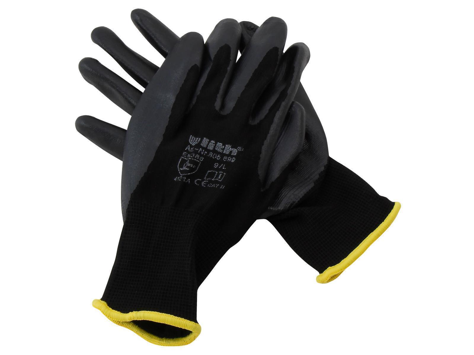 • Montage-Nitril-Feinstrickhandschuhe • schwarzes-13G Trägermaterial • schwarze Nitril-Beschichtung • geschäumt für bessere Griffigkeit • ergonomische Passform • EN388 Schutz vor mechanischen Risiken (Abrieb-, Schnitt, Reiß- und Durchstichfestigkeit)