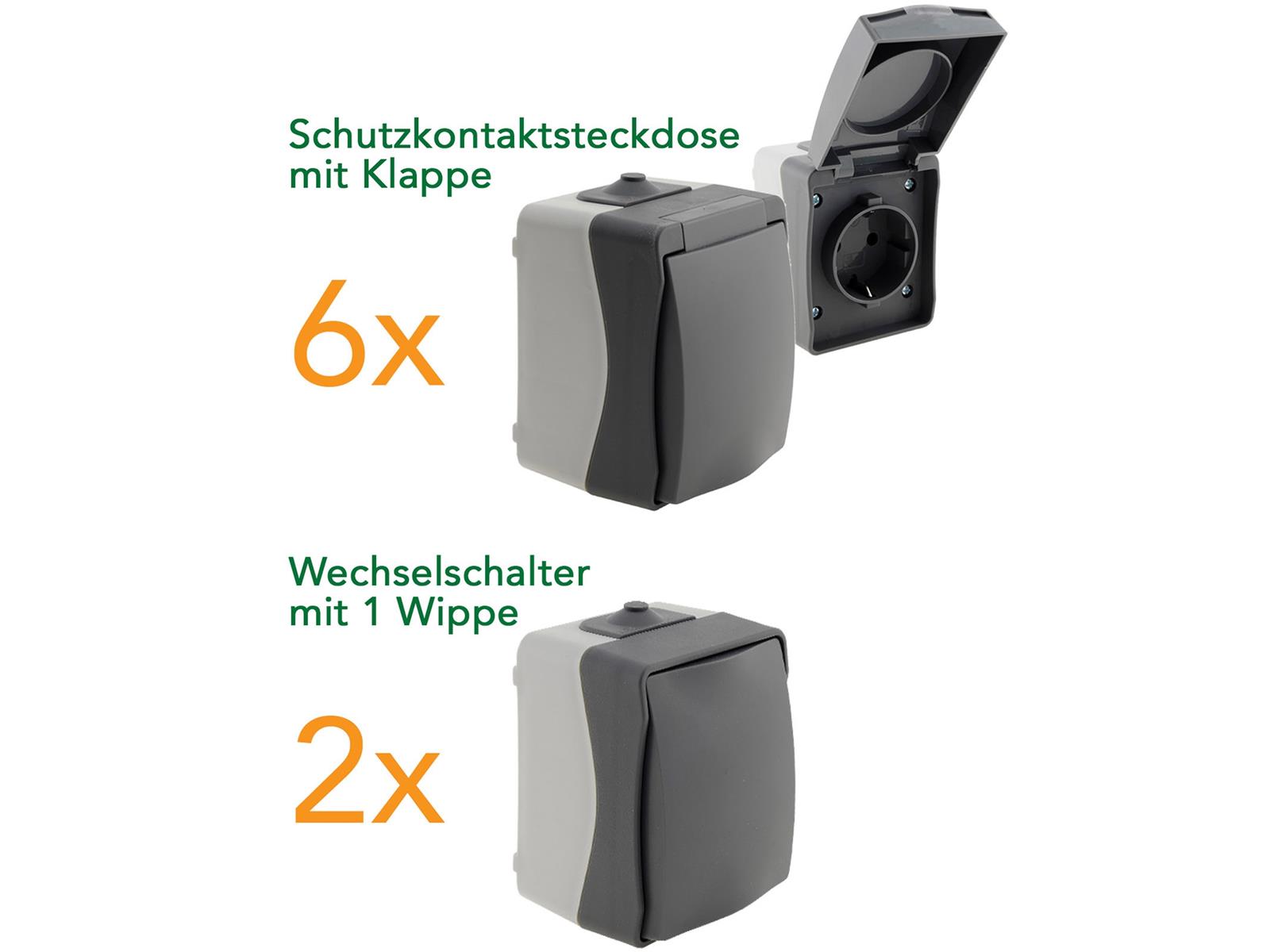 Spritzwassergeschützes Starterset im modernen Design für Feuchtraum und Aussenbereich. Die Schutzart IP54 eignet sich für Keller, Scheune, Garage etc. Mit Einstecksicherung! Im praktischem Starter-Kit zum Sparpreis. Inhalt: 6x Steckdose 250V/16A und 2x Wechselschalter 250V/10A
