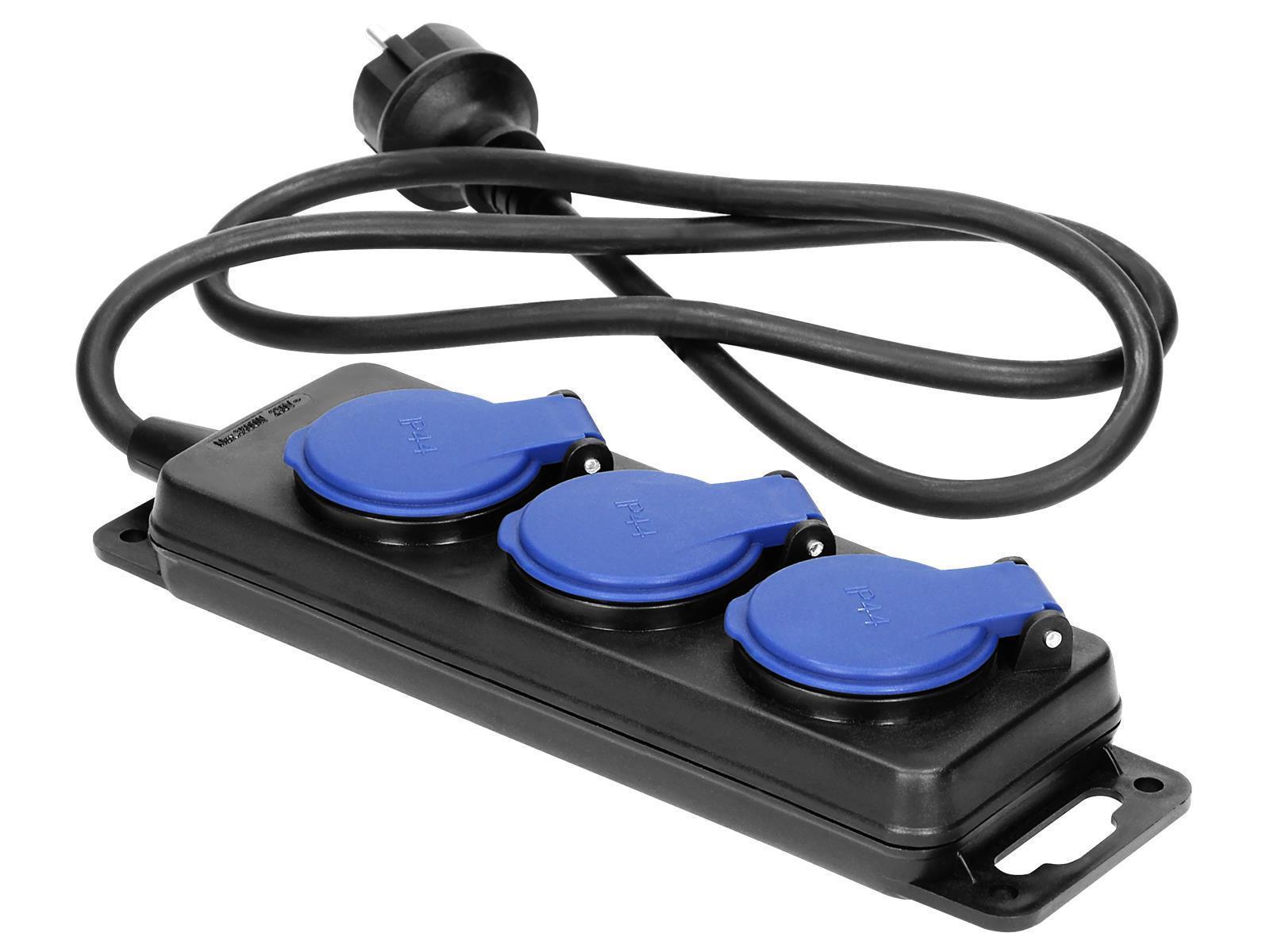 • Schutzkontaktstecker auf 3x Schutzkontaktkupplung • Schutzklasse IP44 • 3m • H05RR-F 3G1.5 • 3x 1,5mm² • max. 16A • Farbe: Schwarz