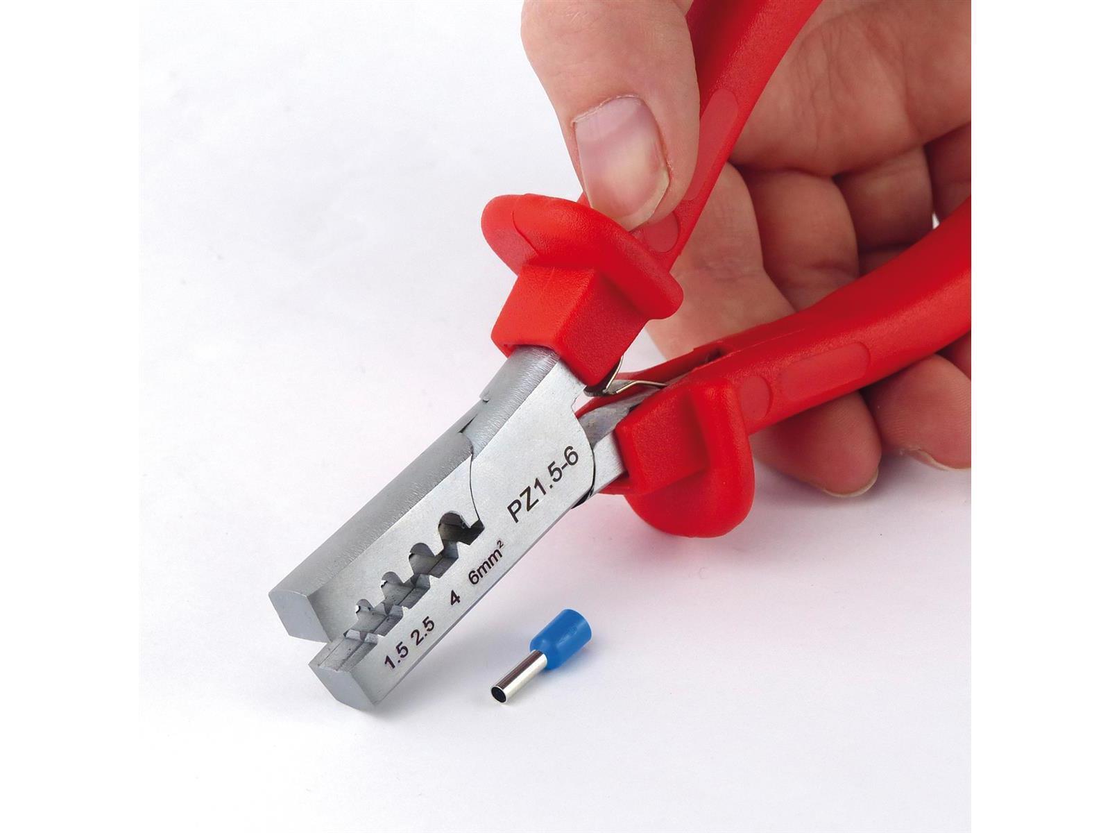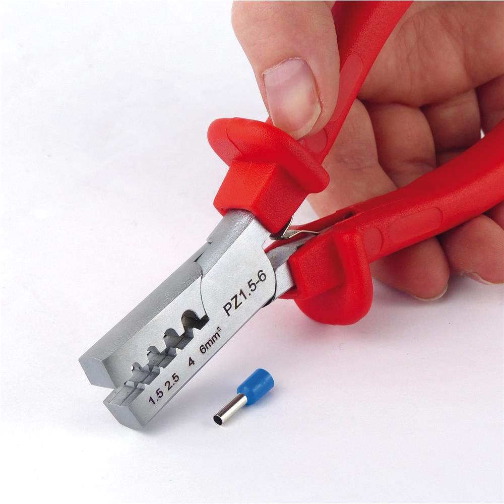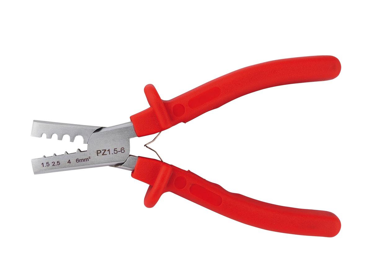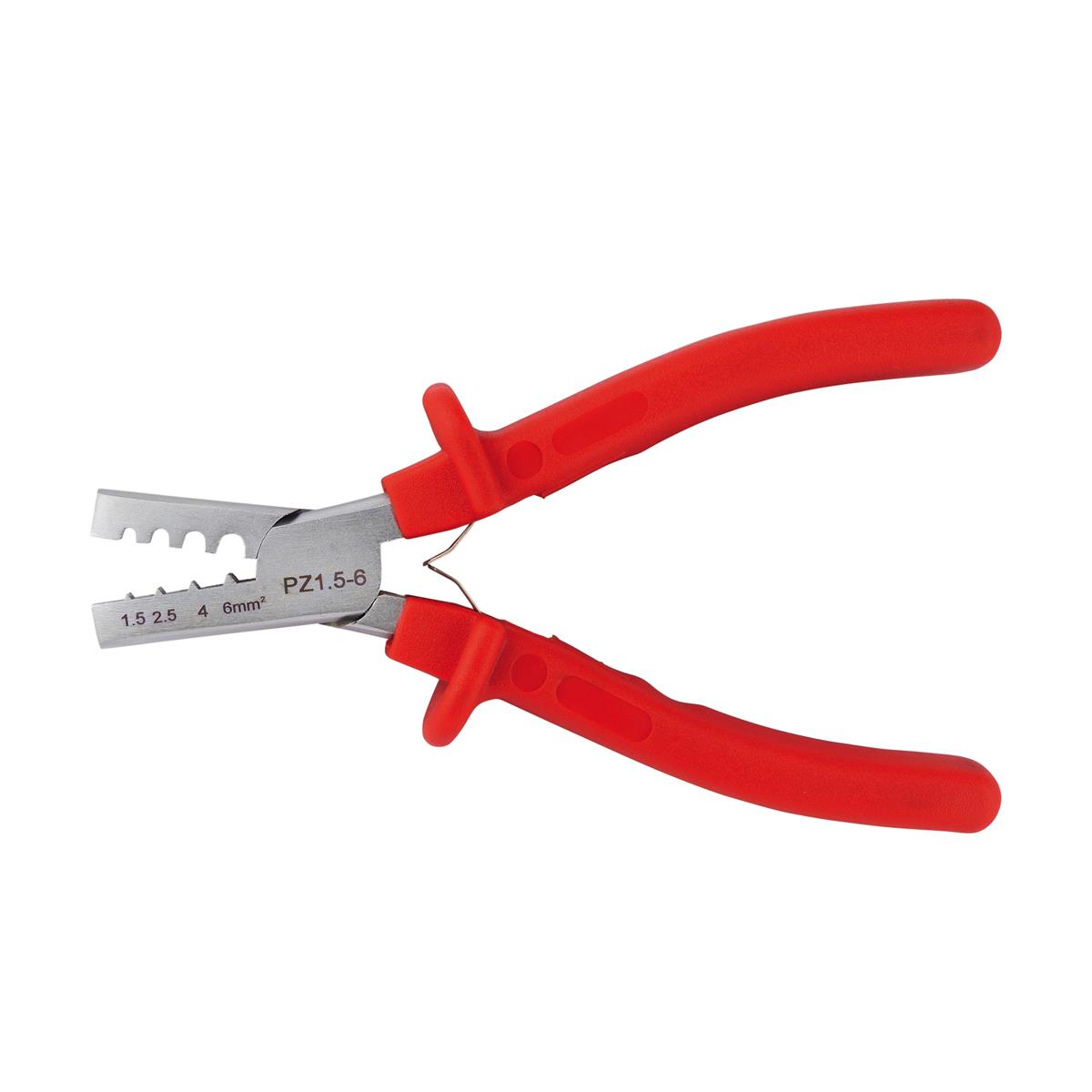 Presszange für Aderendhülsen von 1,5 bis zu 6 mm² (1,5 / 2,5 / 4 / 6 mm²). Rückholfeder, Ergonomisch geformter Griff für leichte Bedienung.