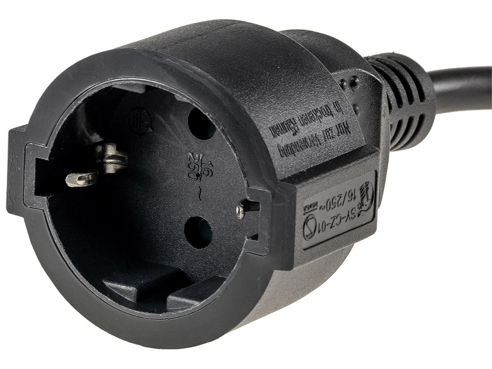 Steckdosenleisten mit beleuchtetem Schalter und um 45° abgewinkelten Schutzkontakt-Steckdosen und Winkel-Schutzkontaktstecker