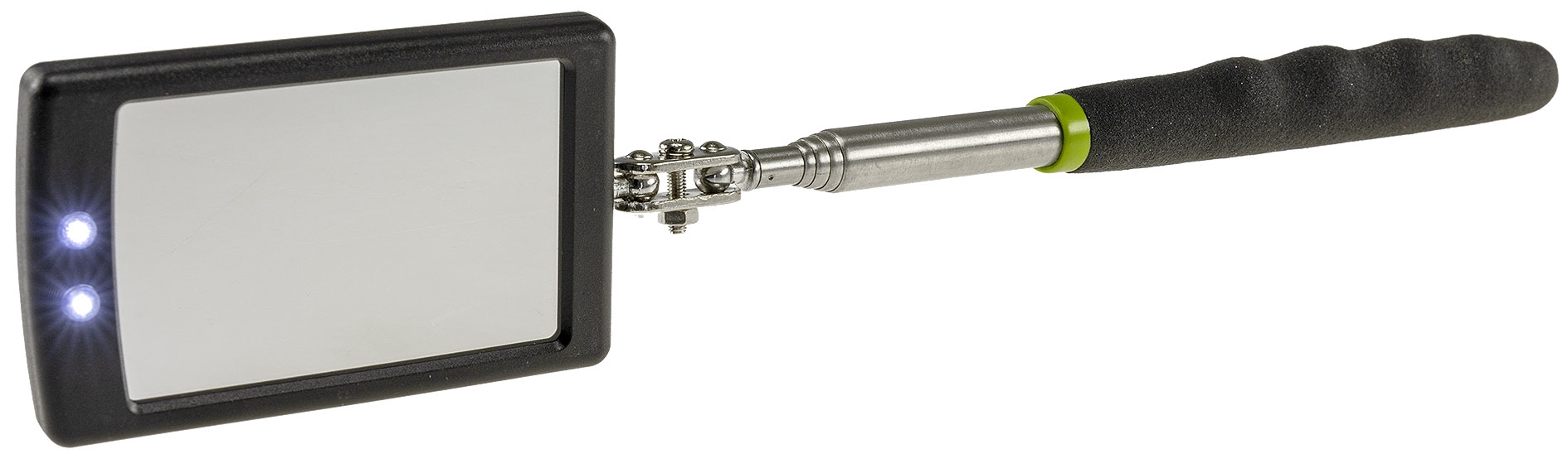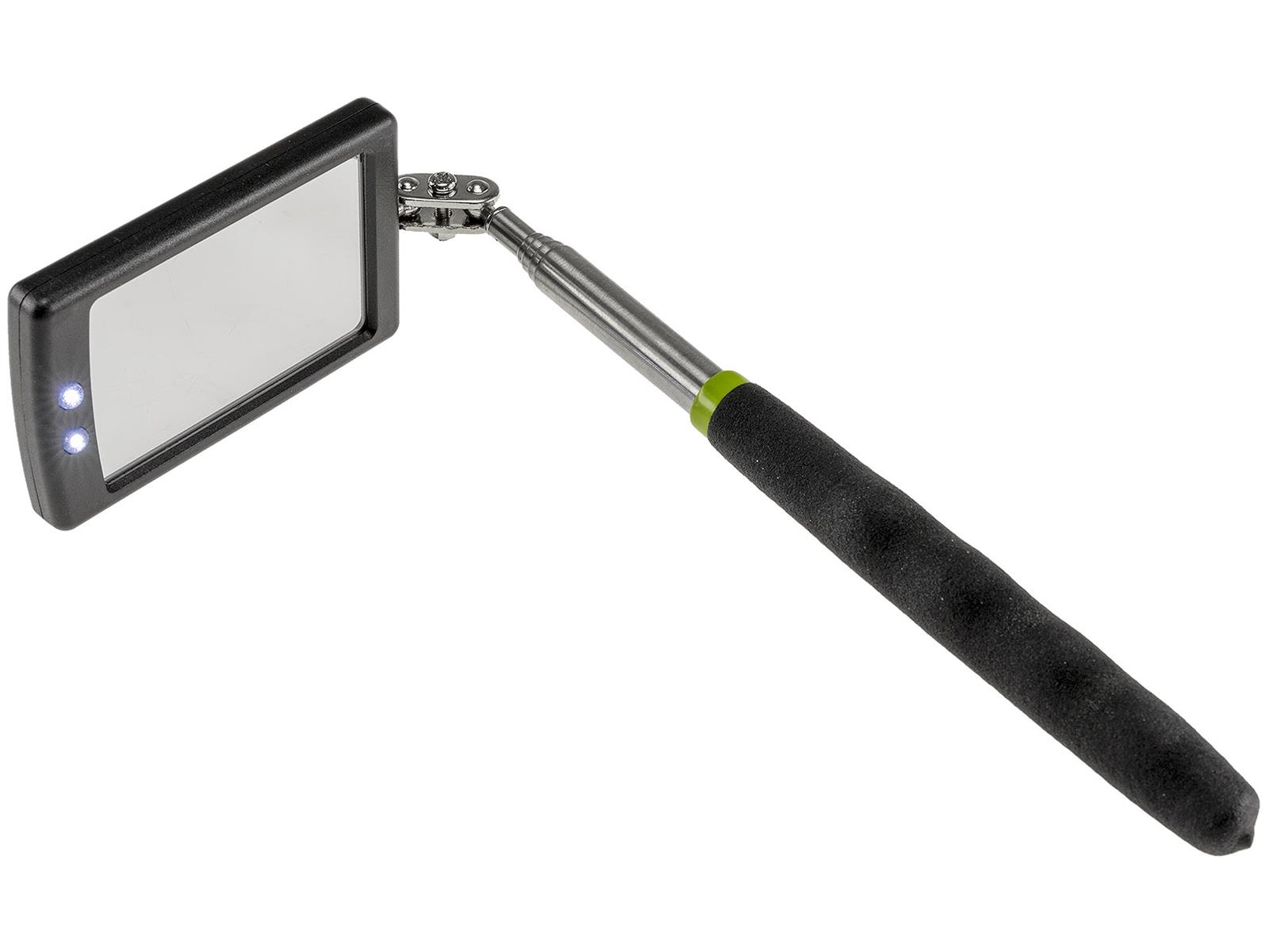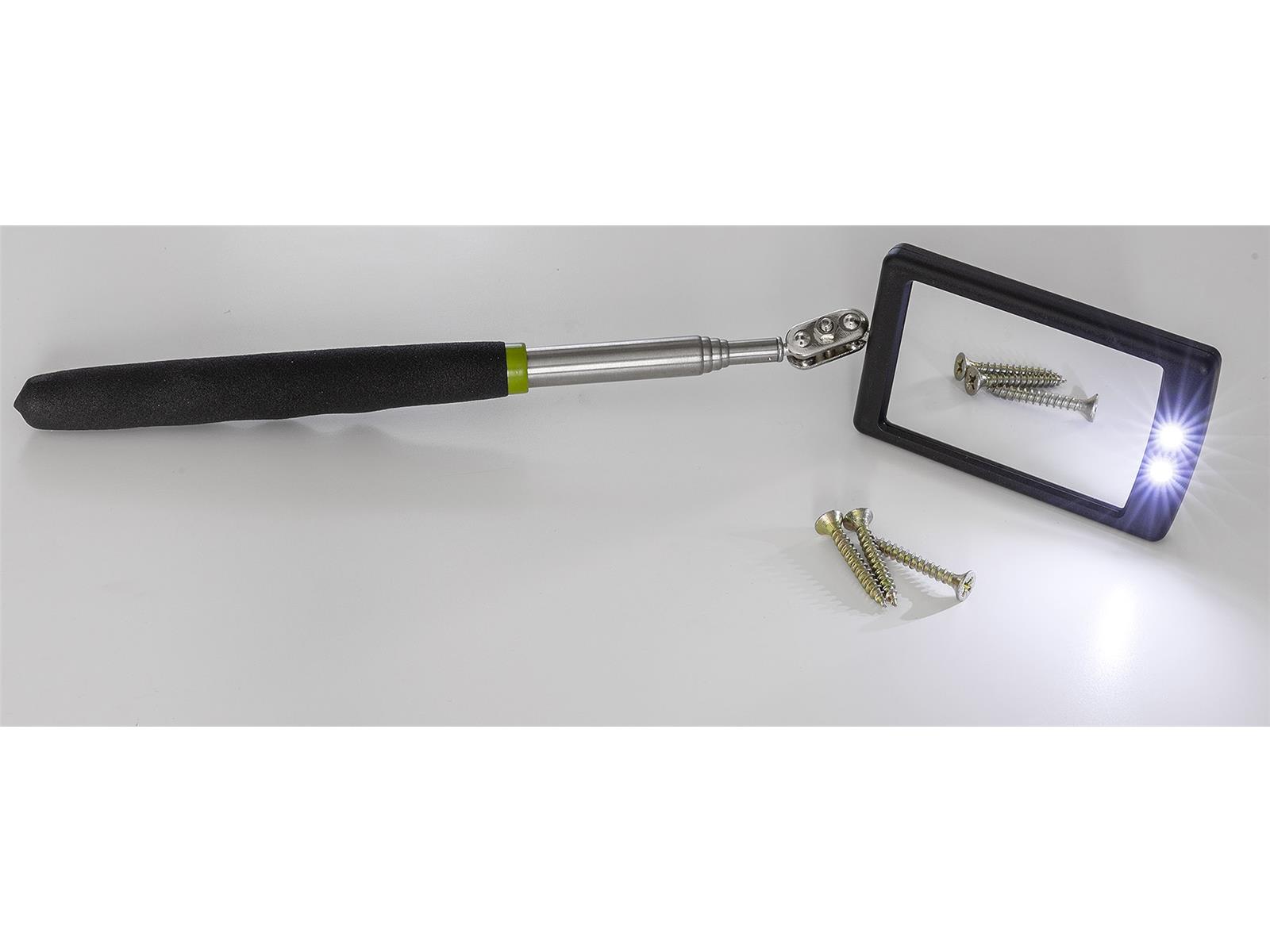 Wo ist es hin und wie sieht es in der hintersten Ecke aus? Der praktische Teleskopspiegel mit zwei parallelen Kugelgelenken zeigt Ihnen, was Sie sonst nur schwer oder gar nicht zu Gesicht bekommen. Und ist es in der hintersten Ecke zu dunkel, helfen die 2 weißen LED-Lampen, Licht in die Angelegenheit zu bekommen. Mit durchdachtem Softgriff für sicheren Halt.