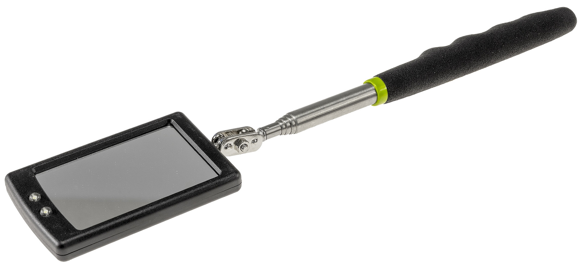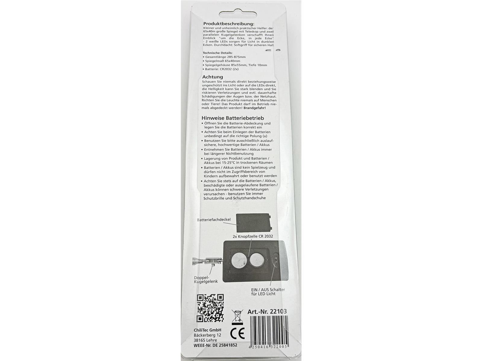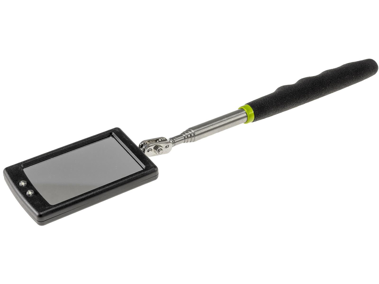 Wo ist es hin und wie sieht es in der hintersten Ecke aus? Der praktische Teleskopspiegel mit zwei parallelen Kugelgelenken zeigt Ihnen, was Sie sonst nur schwer oder gar nicht zu Gesicht bekommen. Und ist es in der hintersten Ecke zu dunkel, helfen die 2 weißen LED-Lampen, Licht in die Angelegenheit zu bekommen. Mit durchdachtem Softgriff für sicheren Halt.