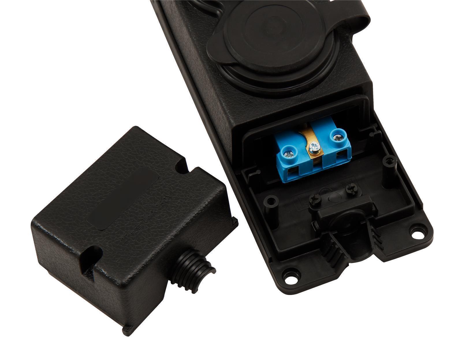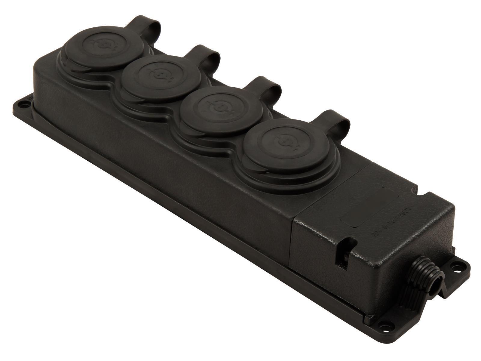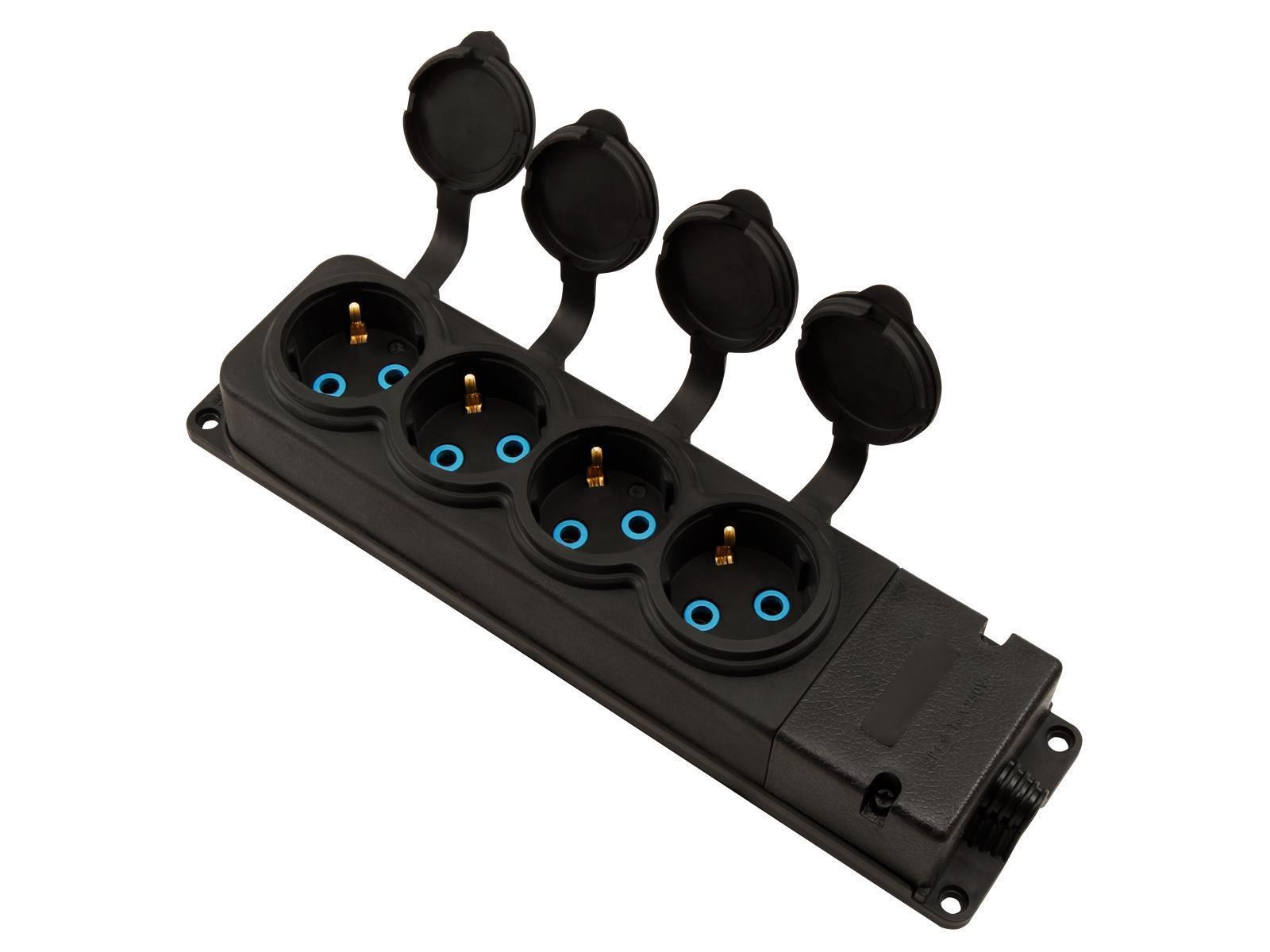 • 4fach Schutzkontakt Steckdose • 250 V~ • 16 A • für Kabel der Typen H05VV-F 4x 1,0 mm² oder 4x 1,5 mm² • IP44 • Material Kautschuk • Farbe schwarz • flammhemmendes Gehäuse