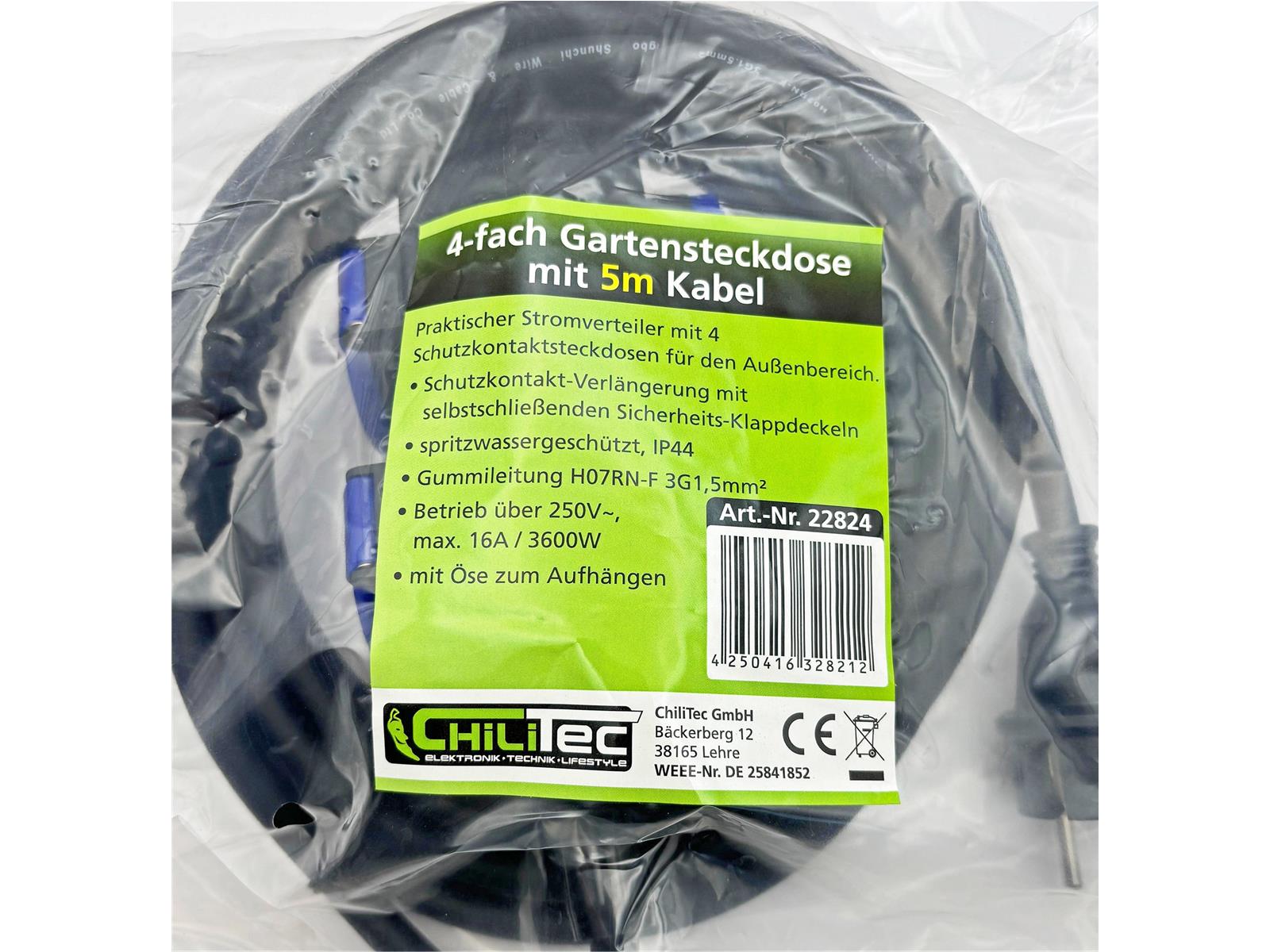 Praktischer Stromverteiler mit 4 Schutzkontaktsteckdosen für den Außenbereich.